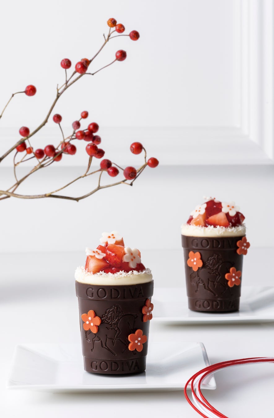 新年のお祝いにぴったりな、紅白のデコレーションをあしらったニューイヤー期間限定のクープショコラです。苺を贅沢に使用し、ダークチョコレートカップの中には、スポンジ、ホイッピングクリーム、ミックスベリーが層になっています。