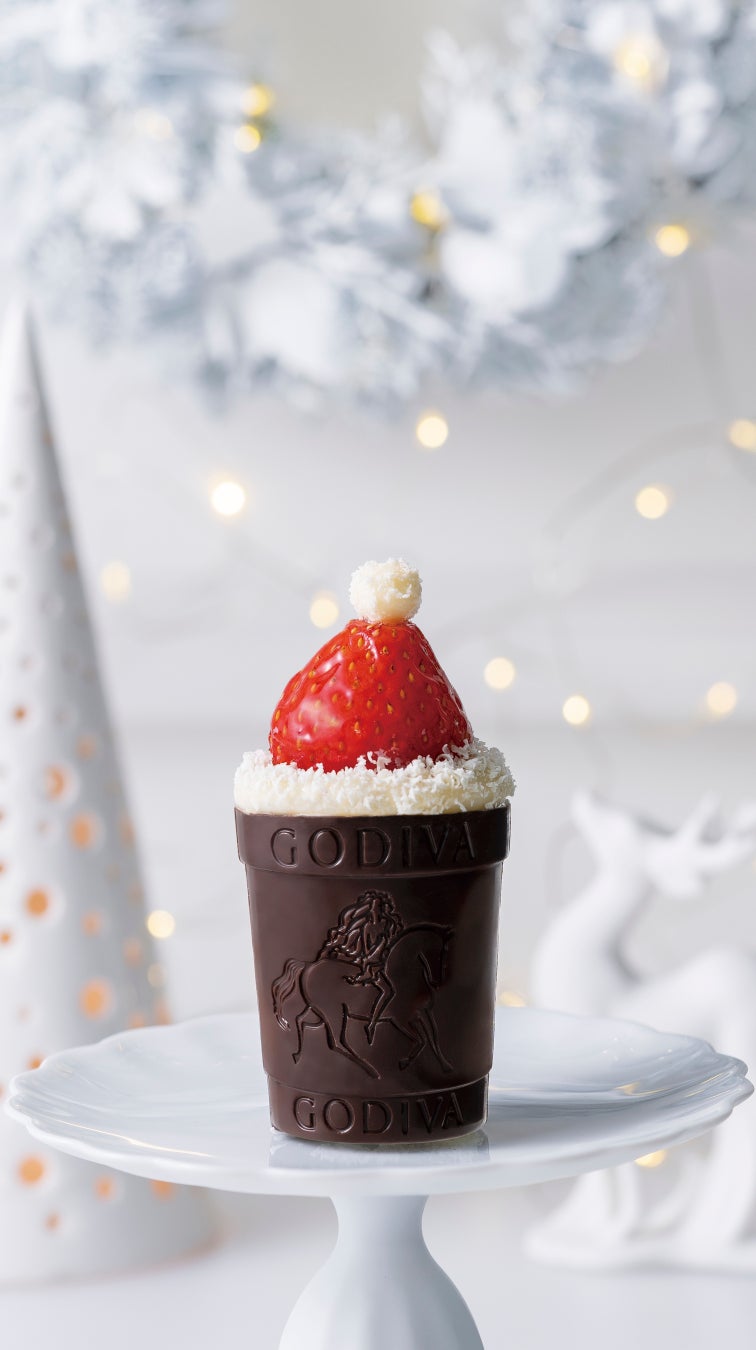 苺を丸ごと使って、サンタクロースの帽子を表現したアイコニックなデザインがキュートなクープショコラです。ダークチョコレートカップの中には、スポンジ、ホイップクリーム、ミックスベリーが層になっていて、苺のショートケーキのような味わいを楽しめます。