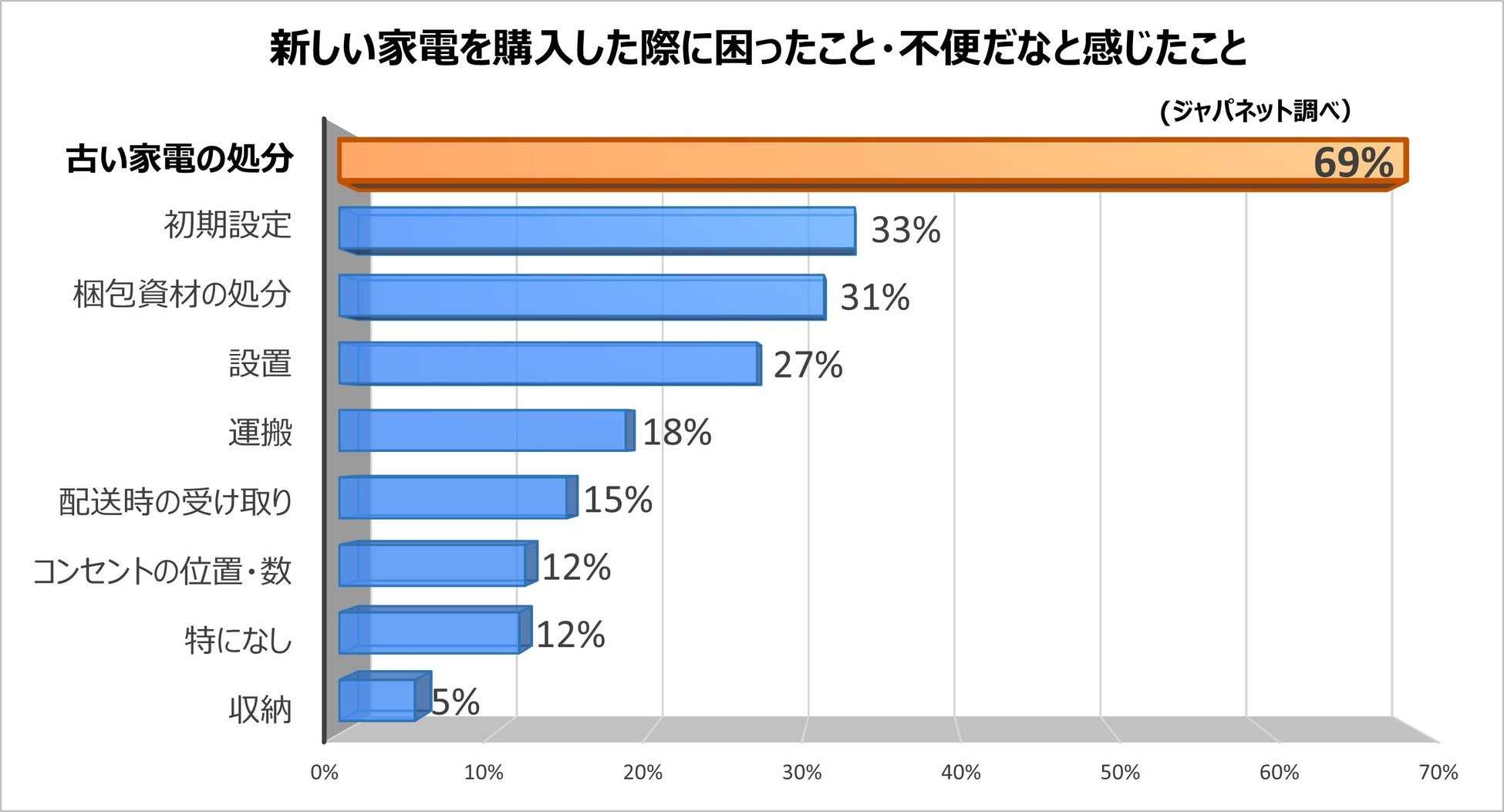 ジャパネットのメルマガ会員を対象に行ったアンケートでは、「新しい家電を購入した際に困ったこと・不便だなと感じたこと」の1位が「古い家電の処分」で、回答者の約7割を占める結果に。