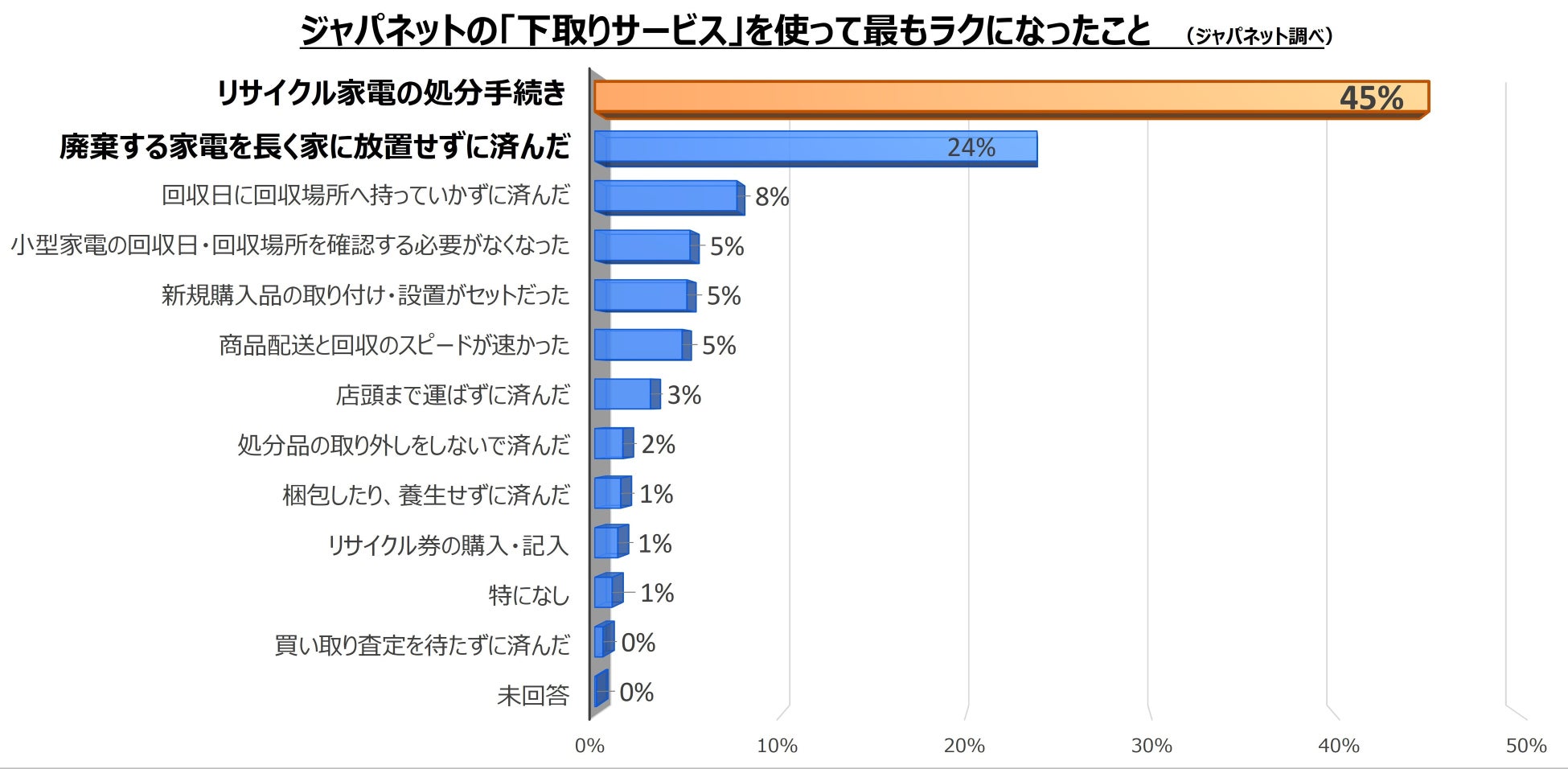 ジャパネットの下取りサービスをご利用いただいた方に「最もラクになったこと」をアンケート調査。「リサイクル家電の処分手続き」という声が45%と圧倒的な1位を獲得。2位は「廃棄する家電を長く家に放置せずに済んだ」で24%でした。