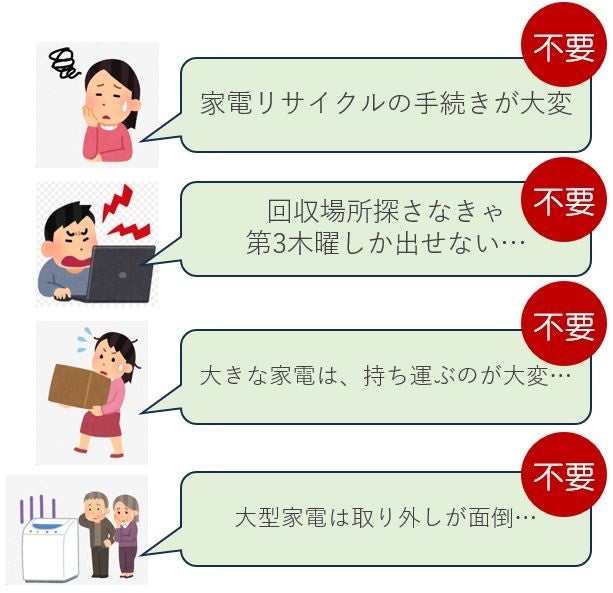 通常、市区町村ごとに違う処分ルールを調べたり、家電の種類によっては「家電リサイクル券」が必要になったり、廃品の回収日まで使わなくなった家電を置いておく等、様々な対応が発生することから、家電の処分に困るという声がありました。
