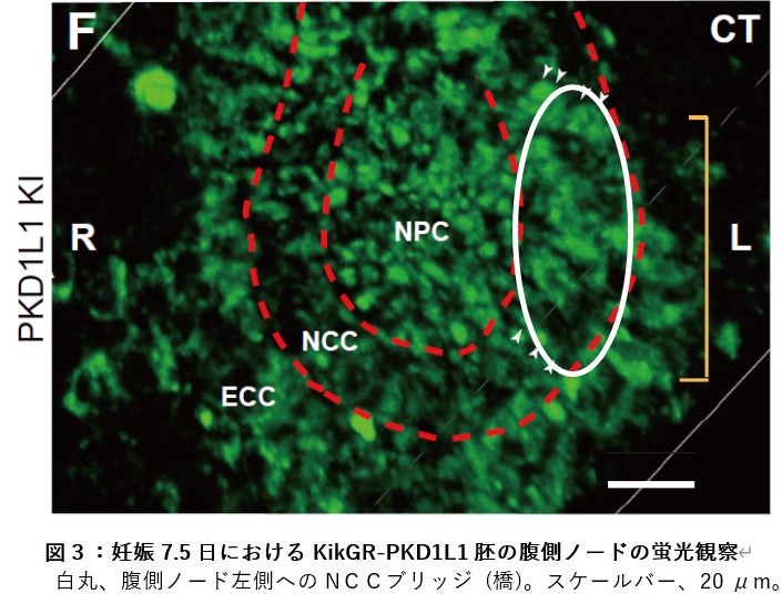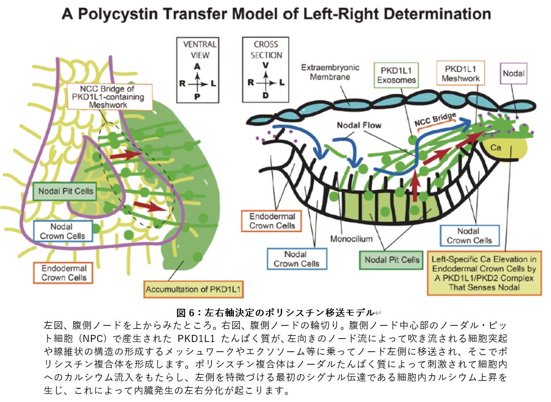 今回、発表者らがノード流の研究を深めるため、細胞内のカルシウム上昇に関係する PKD1L1 ポリシスチンたんぱく質(注6)を蛍光で光るようにしたマウスを作製したところ、腹側ノードの内部からノード左端に向かって、ポリシスチンを含む線維状の構造が撚り合わさった「橋」がかかり、ポリシスチンがノード内部から左向きに移送されていく現象を発見しました。さらにノード左側に集積したポリシスチンが、ノーダルたんぱく質(注7)と結合することによって、細胞内のカルシウム上昇が起こります。こうして、ノード流が腹側ノード左側特異的にカルシウム上昇をもたらす機構の存在が明らかとなりました。
