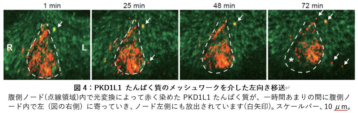 この胚において、腹側ノードに発現している KikGR-PKD1L1 たんぱく質の蛍光を緑色から赤色に光変換した後、1時間強にわたり、蛍光顕微鏡の上で撮影しました。その結果、腹側ノード内で赤色に変化した KikGR-PKD1L1 たんぱく質が徐々に左側にシフトして、ノードの左側に移送されていくようすを観察することができました (図4)。