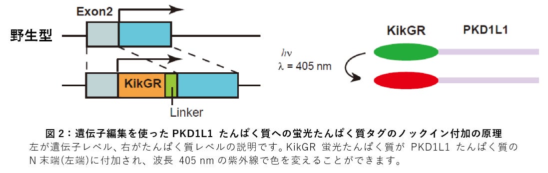 CRISPR/Cas9 法を用いて、マウス受精卵のゲノム編集を行い、PKD1L1 たんぱく質のN末端にKikGR 蛍光たんぱく質を融合して発現させることに成功しました。このノックインマウスは特に大きな発生の異常もなく、個体内のPKD1L1 たんぱく質がすべて蛍光で光ってみえるようになっています。さらにこの KikGR たんぱく質は紫外線の照射で緑色から赤色へと変化しますから、ある部位のみに紫外線を照射して色を変えておけば、その部分の PKD1L1 たんぱく質がその後どうなるか追跡することができるというわけです (図2)。
