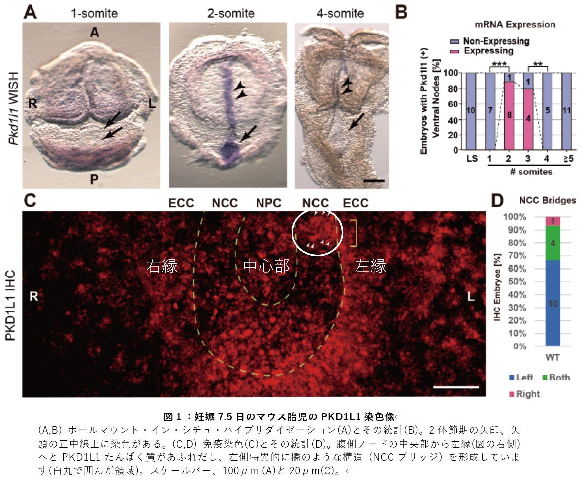 わたしたちの内臓の左右非対称性は生命の維持に非常に重要な役割を果たしています。たとえば心臓の左心系と右心系が間違ってつながる大血管転位という心奇形は、血液の流れに大きな異常が生じ、出生時に緊急手術をしないと生きていけなくなります。このような内臓の左右非対称性がなぜ生じるのかは発生生物学の永年の謎でした。発表者らは以前、腹側ノード内での線毛回転により左向きのノード流が生じ、その結果として腹側ノードの左側のみで細胞内カルシウムが上昇して左側特異的なシグナル伝達を惹起するという経路を同定しました。この経路の大きなミッシングリンクとして、ノード流がカルシウム上昇を生み出す分子機構が未解明のままでした。今回、光変換可能な蛍光タンパク質 KikGR、CRISPR/Cas9システムによる遺伝子編集を用いた新しいマウスモデルの作成、全胚培養、共焦点顕微鏡観察などの先端的な技術を組み合わせることにより、このミッシングリンクをつなぐ新しい「ポリシスチン移送仮説」を提唱しました。