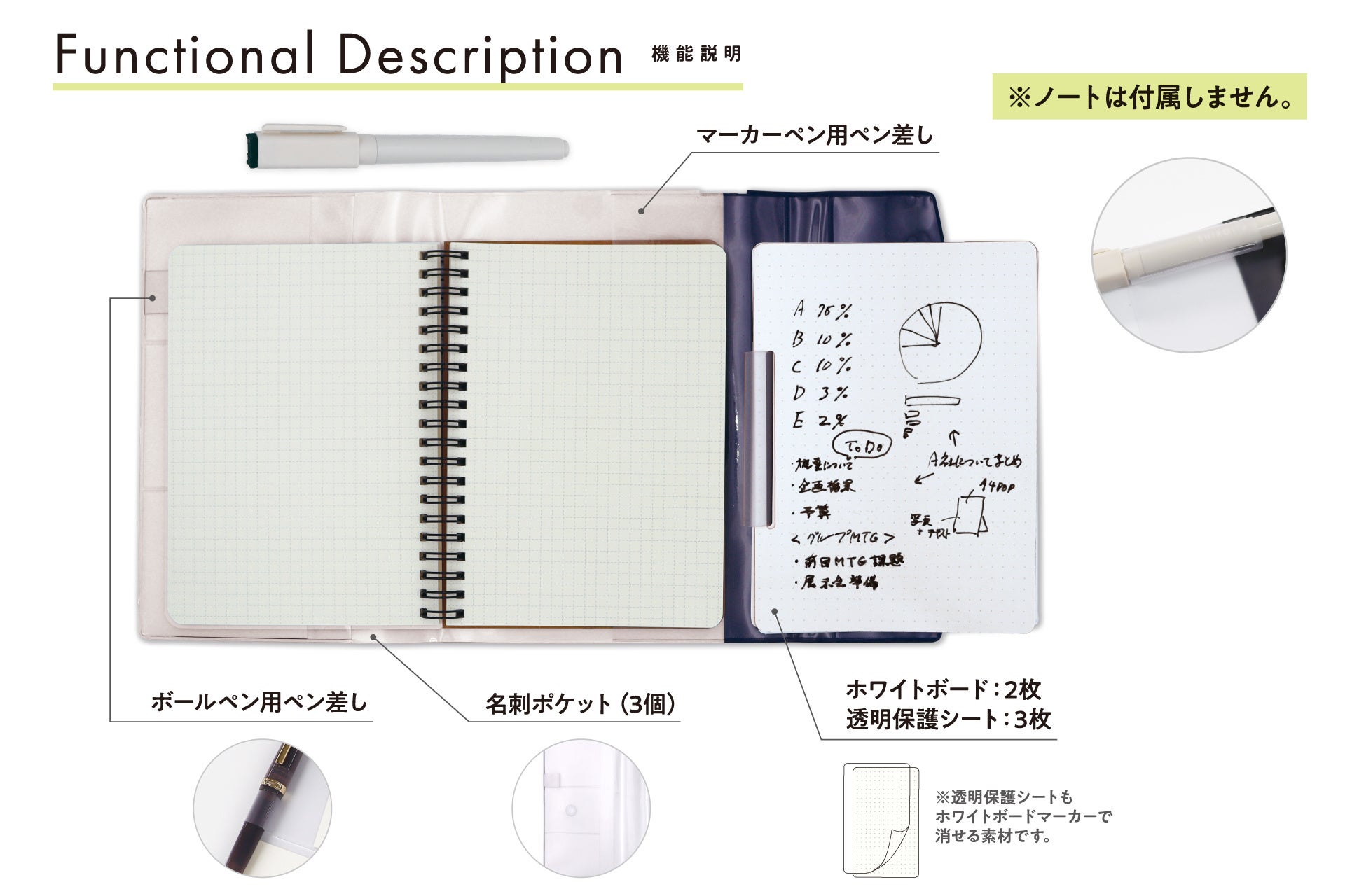 ボールペンなどの紙製ノート用筆記具と、ホワイトボード用マーカーの2本持ちができるように、2種類のペン差しを搭載。名刺ポケットも3個付いているので収納力もばっちりです。