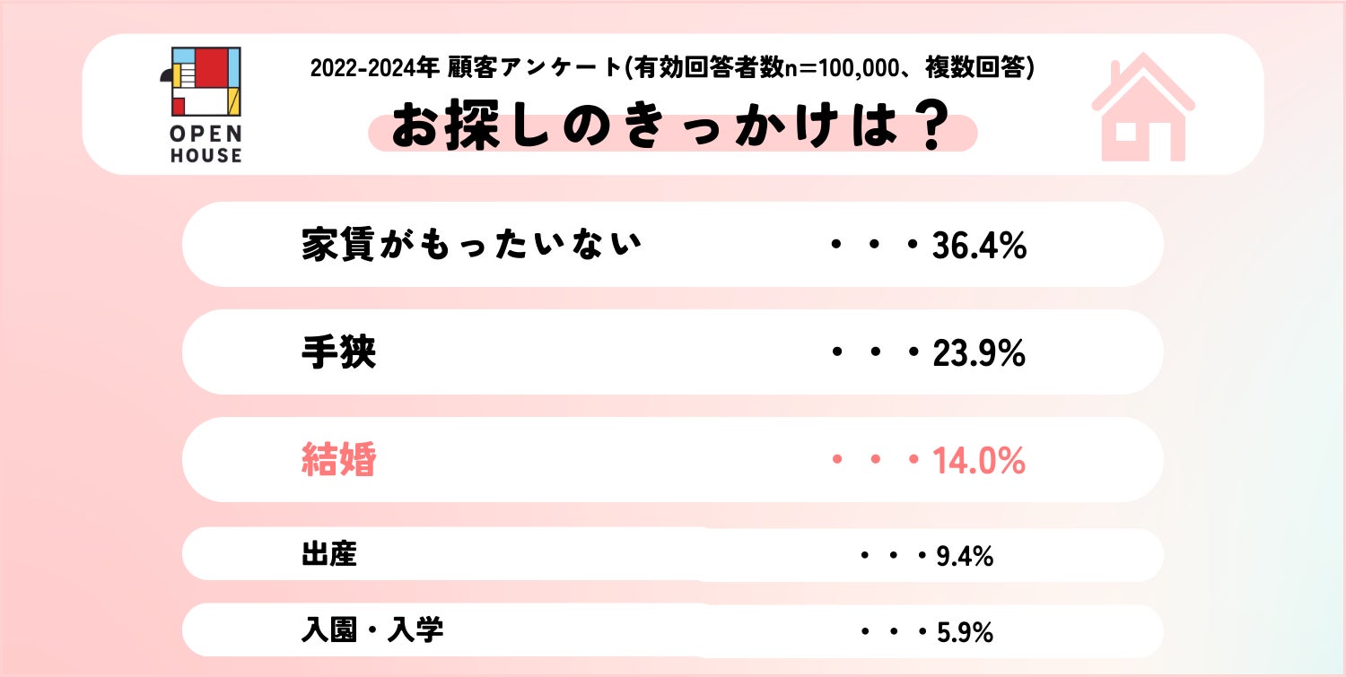 そのため、結婚や出産を契機に住宅購入をされる方には、共働きでペアローンを組まれたり、お互いの仕事のしやすさを最重要視されるカップルも多くいらっしゃいます。実際に株式会社オープンハウスの顧客アンケートによると、「家を探そうと思ったきっかけは?」という質問(複数回答)に対し、「家賃がもったいない」、「手狭」に次いで「結婚」が挙げられており、ライフイベントの中では最も家探しに近いといえます。