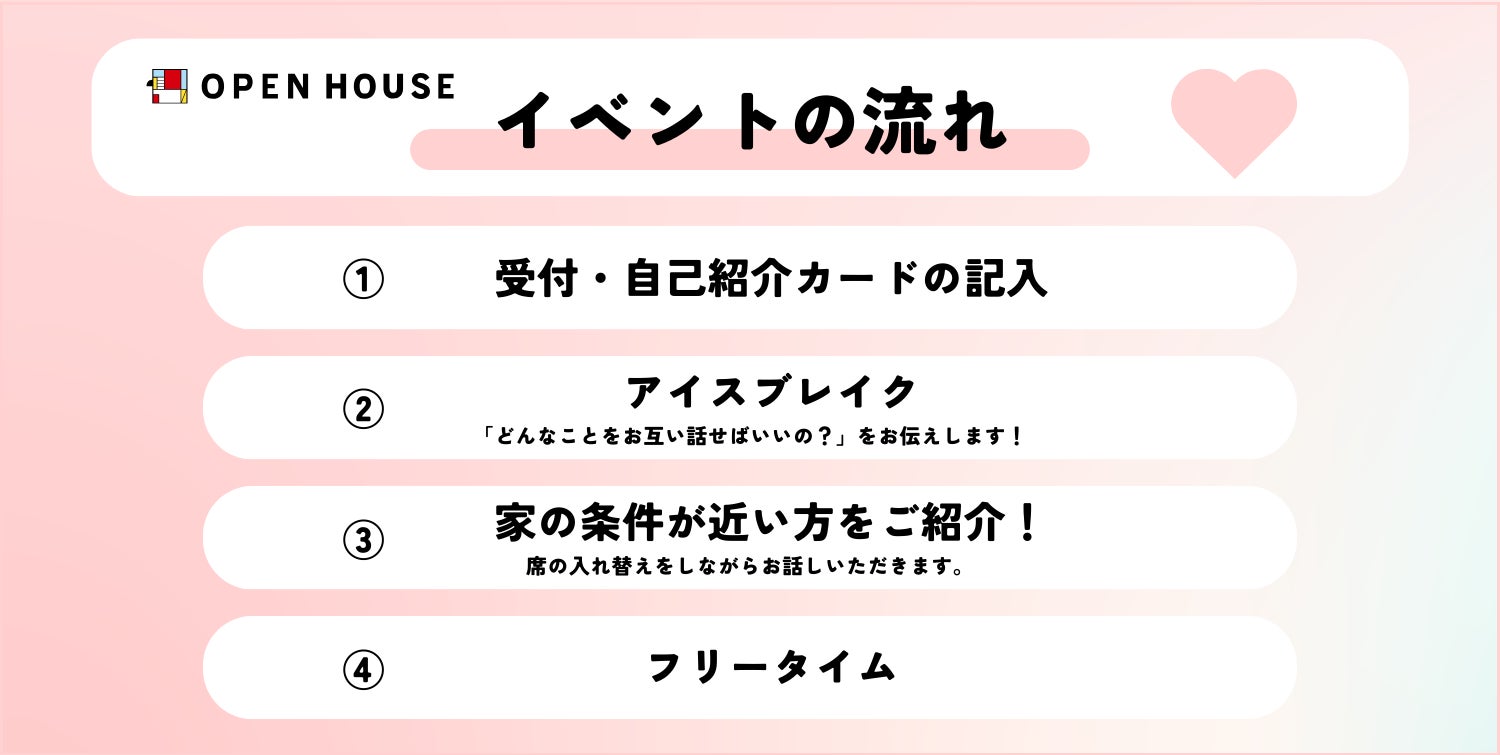 株式会社オープンハウスグループ(本社 東京都千代田区、代表取締役社長 荒井正昭、以下「当社」)のグループ会社である株式会社オープンハウス(本社東京都渋谷区、代表取締役 鎌田 和彦)は、多くの方にマッチングサービス「婚家結」へご登録いただいたため、初めてのオフラインイベント「婚家パーティー」を開催することを決定いたしました。結婚後の理想の住まいや生活スタイルに関する条件をきっかけに、結婚後に一緒に住まわれることを想定して出会っていただくイベントです。