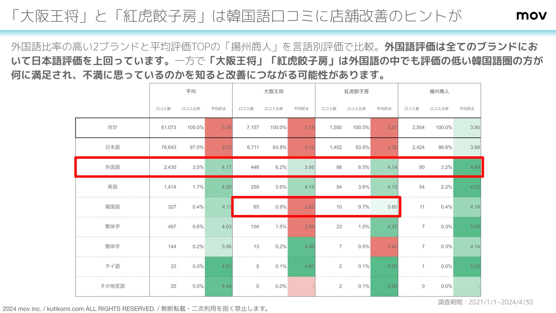 一方で「大阪王将」「紅虎餃子房」は外国語の中でも評価の低い韓国語圏の方が何に満足され、不満に思っているのかを知ると改善につながる可能性があります。