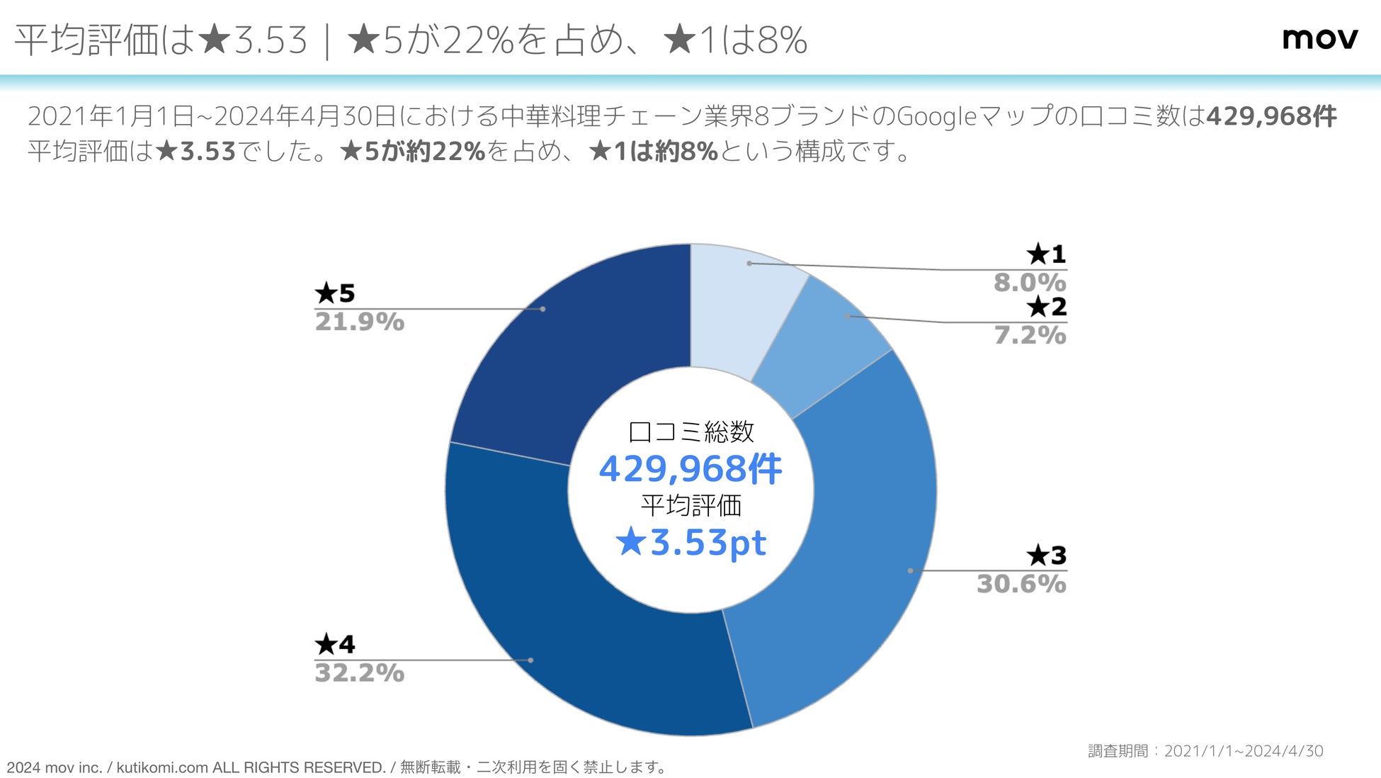 2021年1月1日~2024年4月30日における中華料理チェーン業界8ブランドのGoogleマップの口コミ数は429,968件、平均評価は★3.53でした。★5が約22%を占め、★1は約8%という構成です。