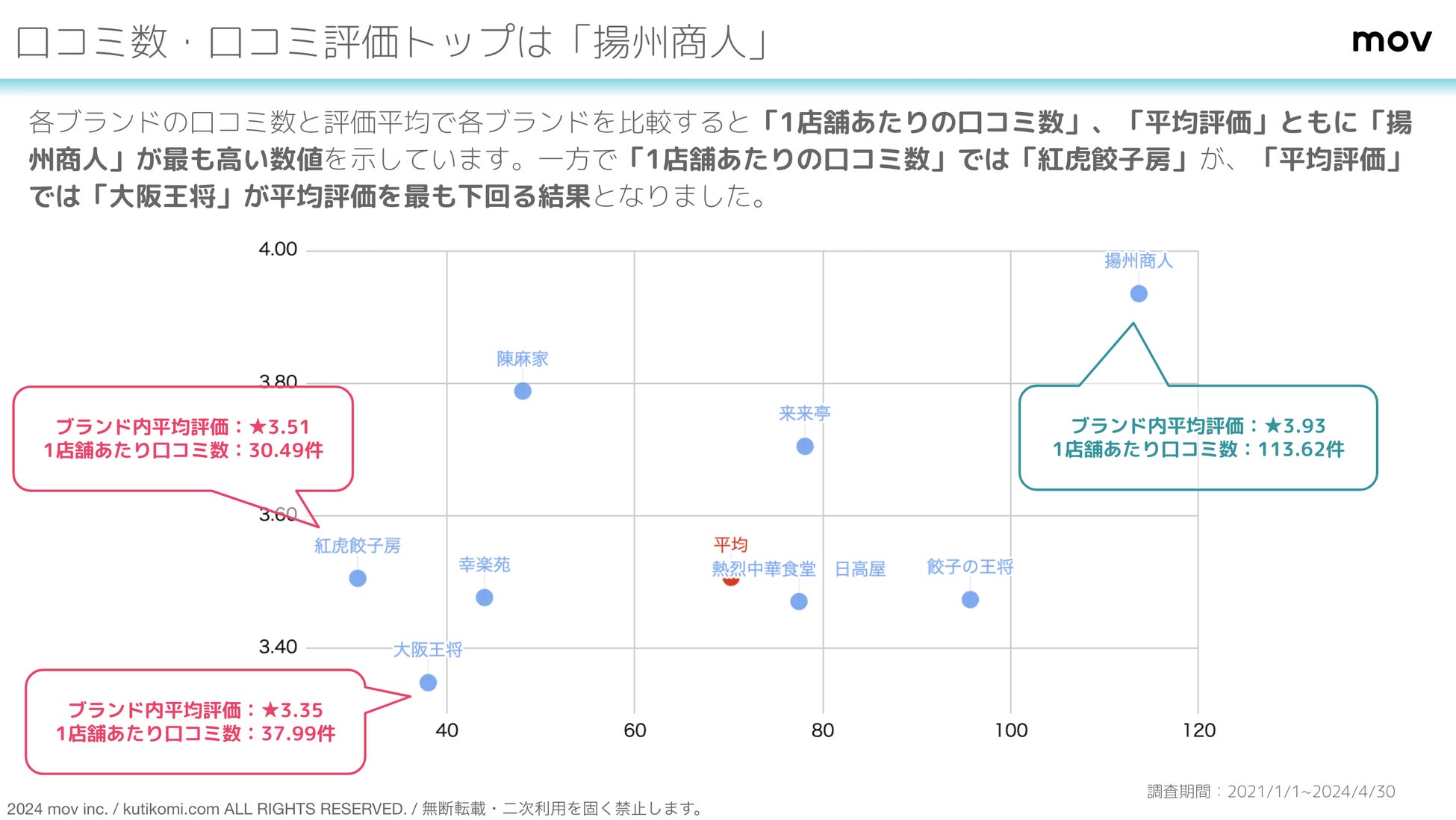 一方で「1店舗あたりの口コミ数」では「紅虎餃子房」が、「平均評価」では「大阪王将」が平均評価を最も下回る結果となりました。