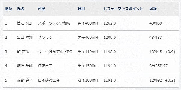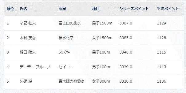 また、1大会のパフォーマンスポイントの合計でグランプリシリーズを通して最も高いパフォーマンスを競う"パフォーマンスランキング"では、パリ2024オリンピック参加標準記録を突破した男子400mハードル・筒江海斗(スポーツテクノ和広)が1位になる結果となりました。