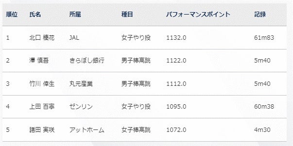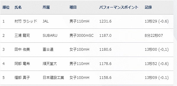 ※「パフォーマンスポイント」は、「記録ポイント」(Scoring Tablesをもとに記録をポイント化したもの)と、「順位ポイント」、「特別ポイント」(日本記録、日本タイ記録、ワールドスタンダード記録を突破した際に付与するもの)を合計したポイントのことを言います。