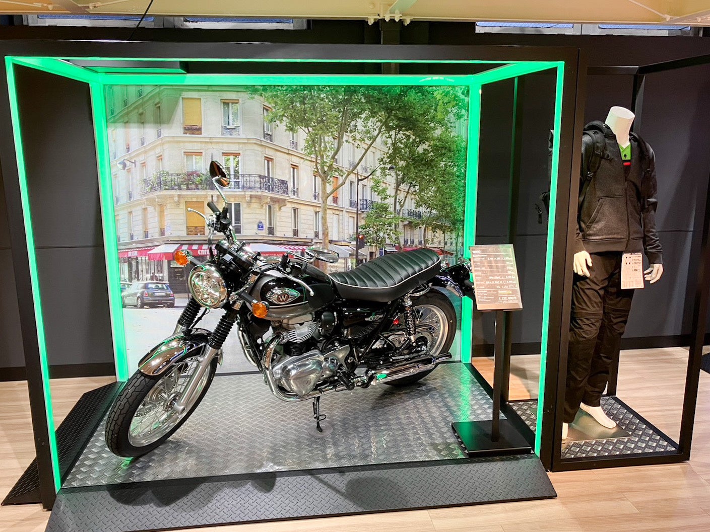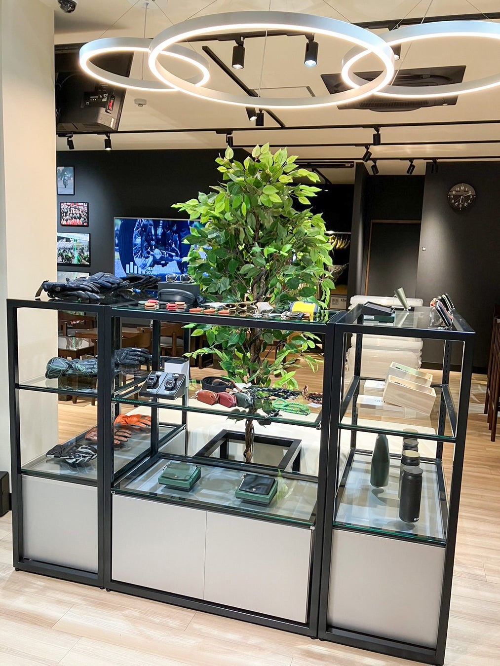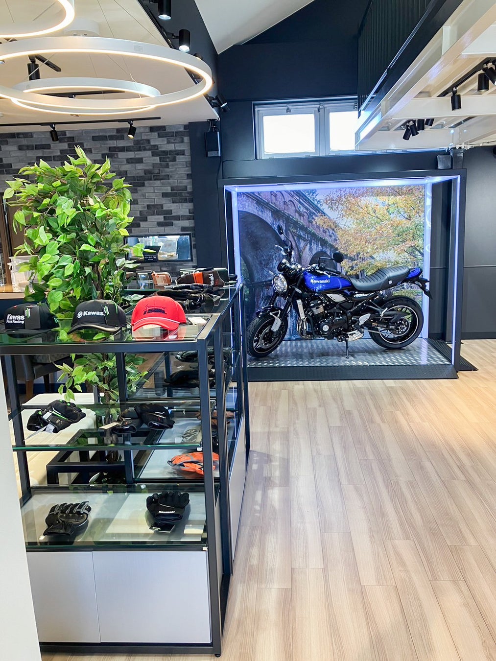 また、モーターサイクルライフを引き立てるアパレルやグッズは、手に取って確かめやすいアイランドスペースに展示されています。