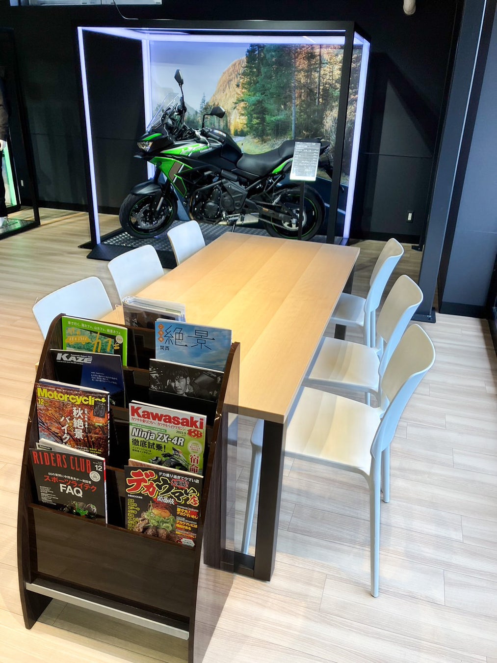 大きな屋根が目印の「カワサキ プラザ加古川」は、白を基調とした明るい店内に生まれかわりました。経験豊かなコンシェルジュとテクニシャンが、皆様のモーターサイクルライフをお手伝いいたします。