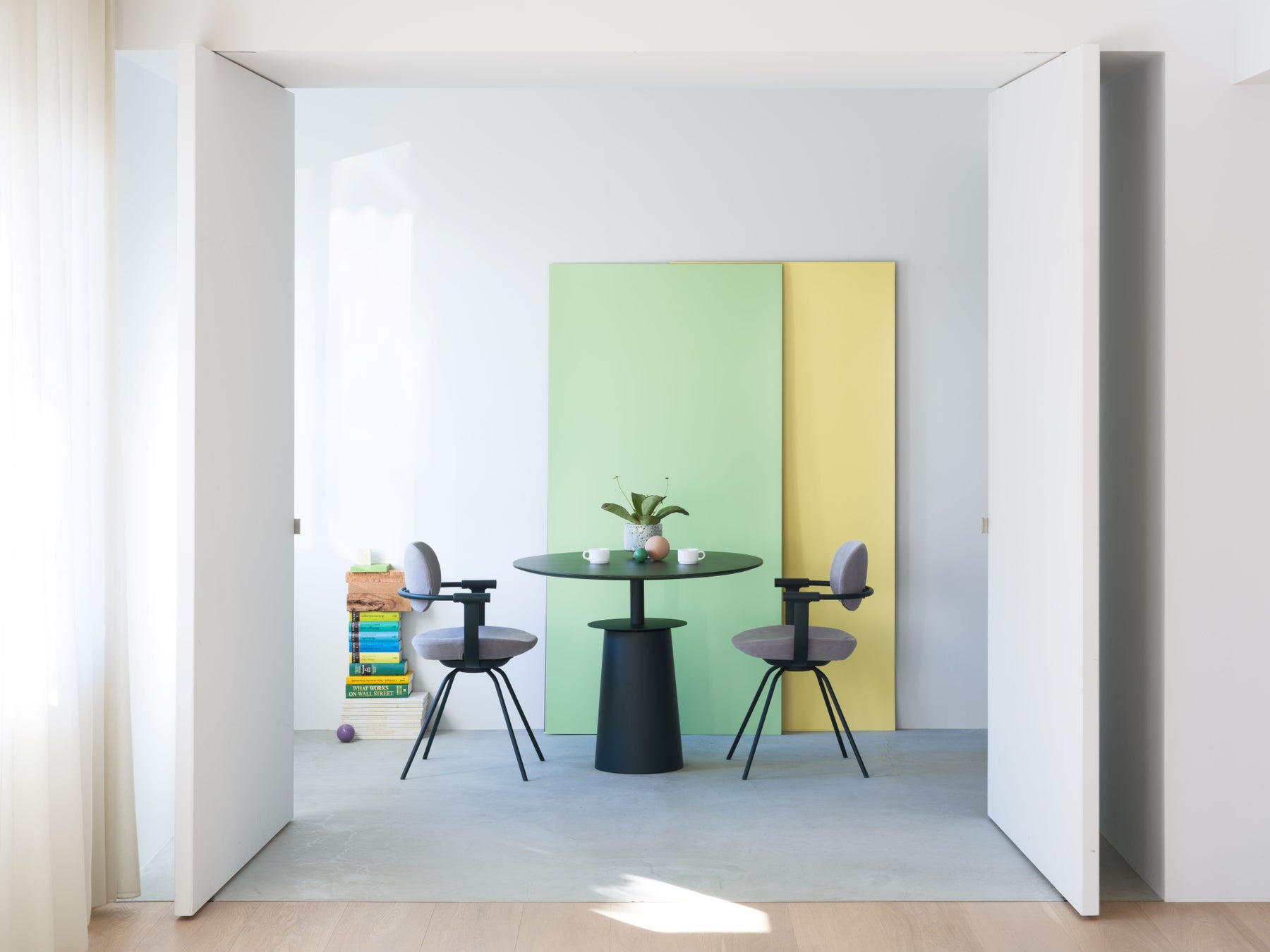 スペイン語で“円錐”を意味するその名の通り、「conos」は、のびやかに広がる美しいフォルムと機能性を兼ね備えた、集いのためのかたち。空間をやわらかくひらき、止まり木のように、人と人との自然なつながりを生み出しながら、これからのオフィスの風景を描いていきます。