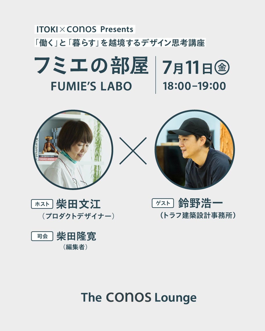 プロダクトデザイナー・柴田文江氏がホストを務めるトークイベント「フミエの部屋」が、今回のイベントで復活。オープニングコンテンツとして、7月11日(金)18時~イベント会場内にて開催します。ゲストには建築家・鈴野浩一氏(トラフ建築設計事務所)を迎え、デザインと空間、そして“働くこと”のこれからについて語り合います。「conos」に込めた想いや、ものづくりの背景に触れる、特別なひとときをお楽しみください。