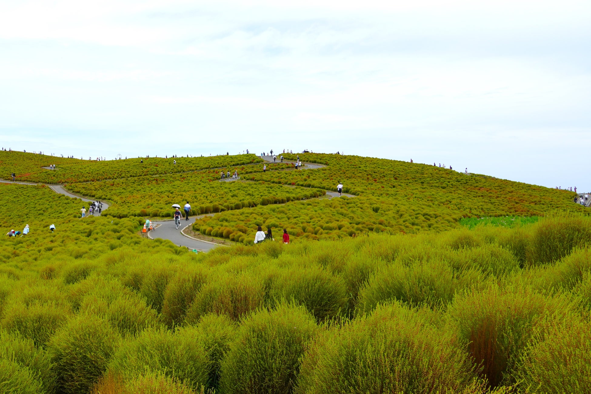 国営ひたち海浜公園「みはらしの丘」のコキアが、10月3日現在「緑葉の見頃」を迎えています。