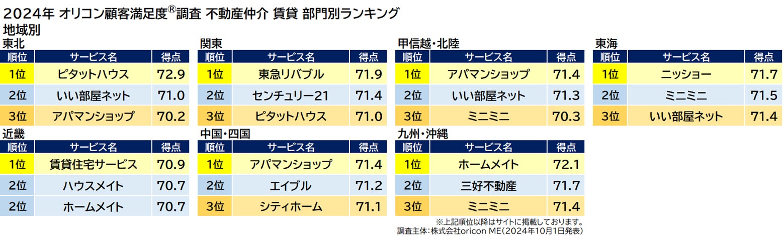 今回の地域別ランキングの結果は、「関東」では【東急リバブル(東急リバブル株式会社 本社:東京都渋谷区)】が初の1位に。【アパマンショップ(APAMAN株式会社 本社:東京都千代田区)】が「甲信越・北陸」では2年連続、「中国・四国」では3度目の1位を獲得しました。「東海」では【ニッショー(株式会社ニッショー 本社:愛知県名古屋市)】が7年連続で1位。「近畿」では【賃貸住宅サービス】が3度目の1位。「九州・沖縄」では【ホームメイト】が2年連続の1位を獲得しました。