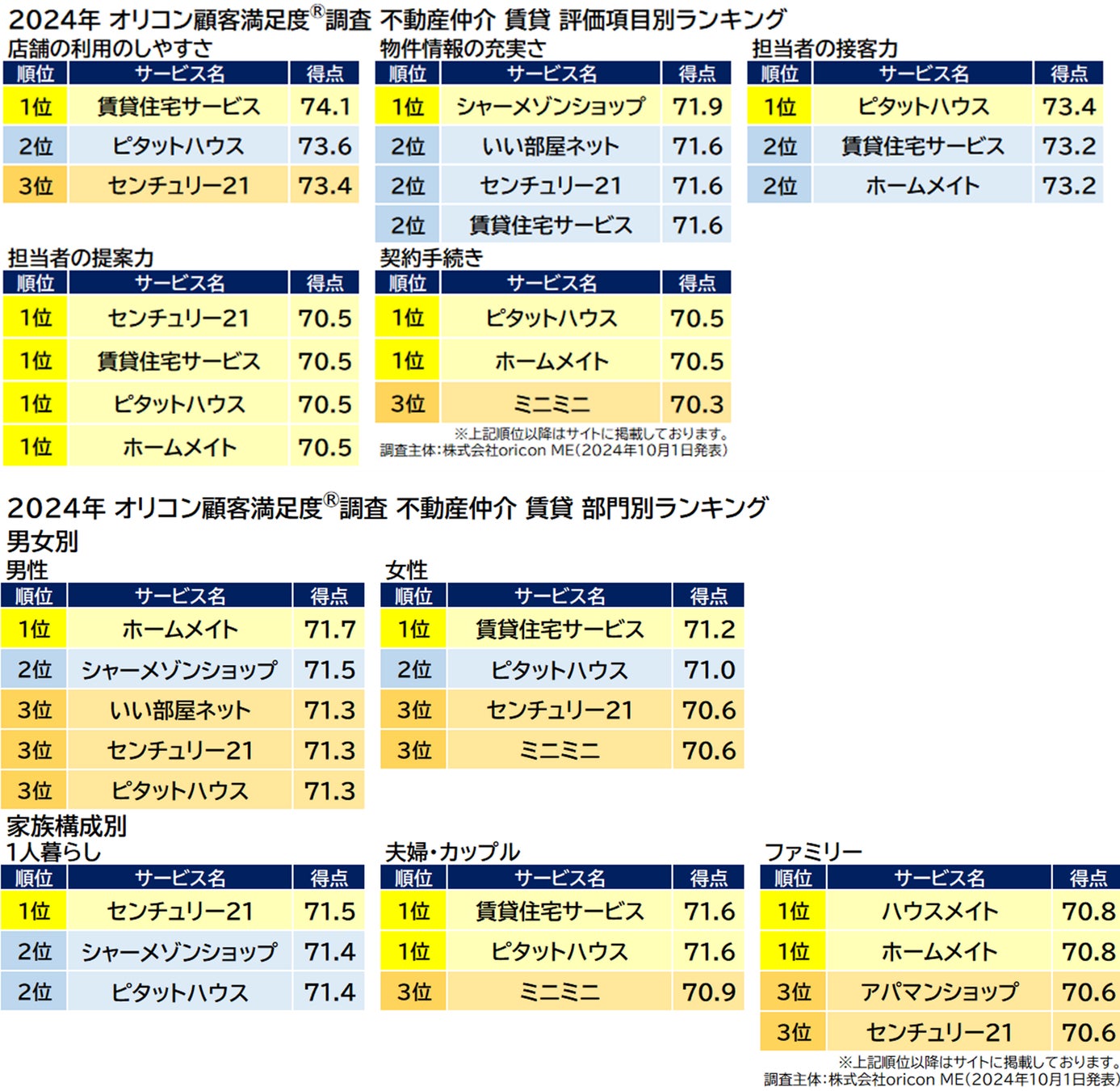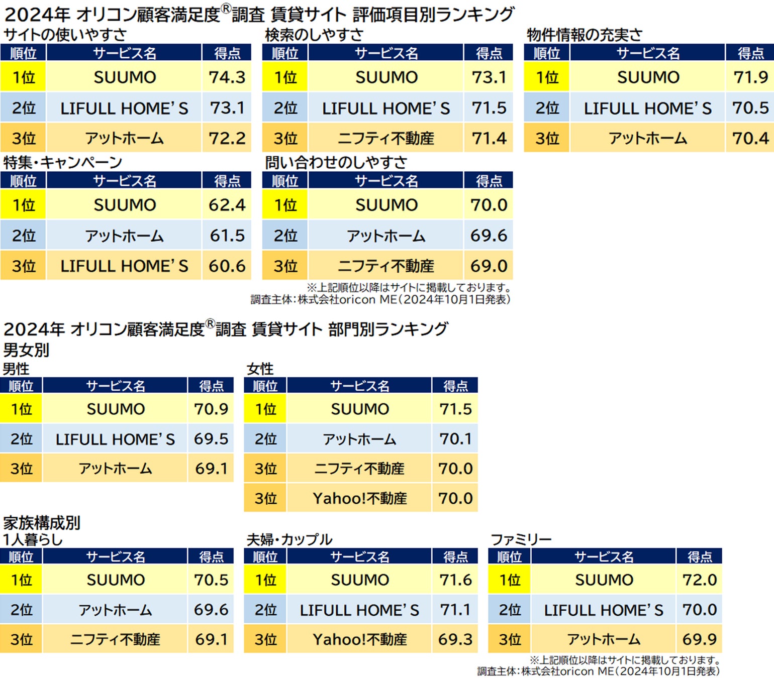■総合 ■評価項目別 『賃貸サイト』(全5項目)「サイトの使いやすさ」「検索のしやすさ」「物件情報の充実さ」「特集・キャンペーン」「問い合わせのしやすさ」 『不動産仲介 賃貸』(全5項目)「店舗の利用のしやすさ」「物件情報の充実さ」「担当者の接客力」「担当者の提案力」「契約手続き」■部門別 □男女別 □家族構成別 □地域別 □都道府県別 (※地域別、都道府県別は『不動産仲介 賃貸』のみ発表)