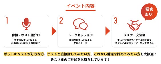 内容 番組ホストたちによるトークセッションや、軽食を囲んでの交流会など、ポッドキャストの"向こう側"に触れられる特別なイベントを開催します。 普段は音声でしか聞けないホストたちと直接会って話せるチャンス。 ポッドキャストを「聴くだけ」から「一緒に楽しむ」場へ、ぜひご参加ください!