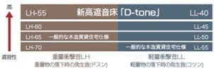 当社オリジナルの新高遮音床“D-tone”を採 用。LH-55、LL-40※2の高い遮音性を実現し、人が聴感上聞こえる領域において、当社従来仕様から最大15db低減しています。