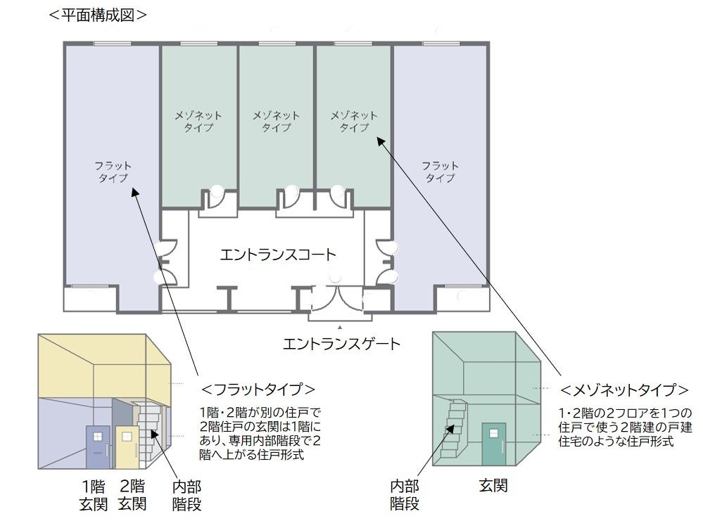 住戸間取り : 両端住戸(フラット) 1階 1LDK+サンルーム、2階 1LDK+マルチルーム、中住戸(メゾネット) 1LDK