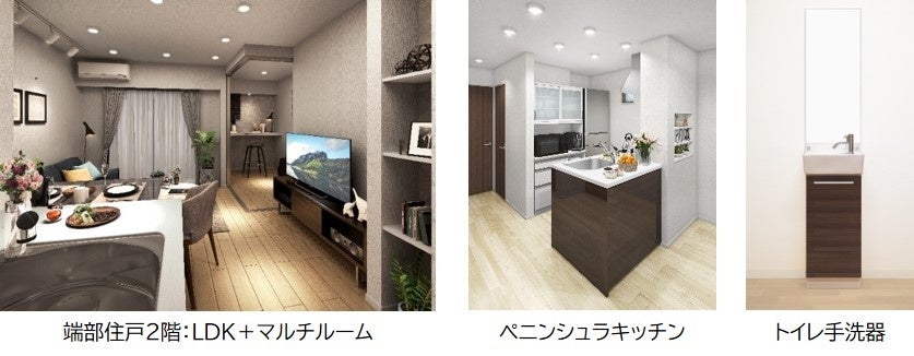 内装には、人造大理石を使ったフルフラットカウンターのペニンシュラキッチンをはじめ、専用手洗い器のあるトイレや1坪ユニットバスを備えています。そのほかにも、テレワークに最適なデスクカウンターやスポット照明、宅配ボックスを設置するなど充実した設備を採用しています。