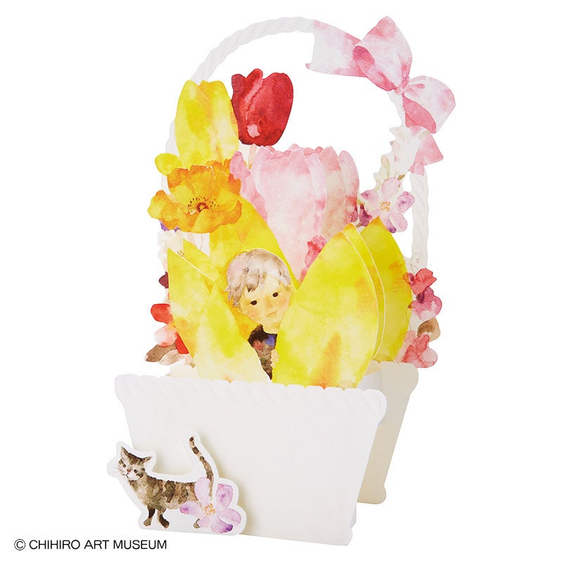 花かごの形の立てて飾れるカードです。かごいっぱいのチューリップと、こちらを見つめる男の子が印象的。かごの模様はエンボス加工(凸状に盛り上げる加工)で表現されています。