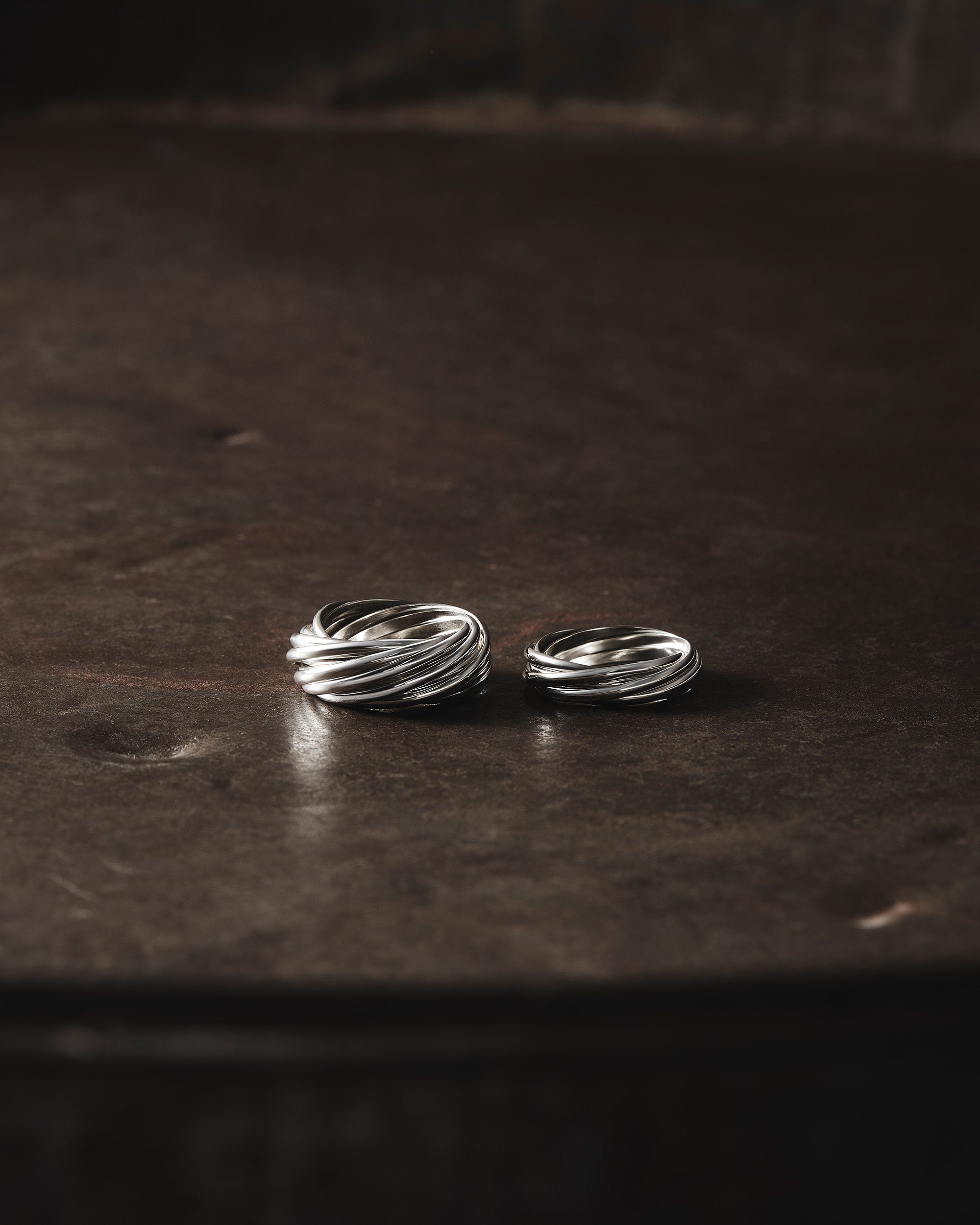 重なった輪の一部を逆方向にねじることで、クロスした立体感のあるリングとしてバリエーションも楽しめます。