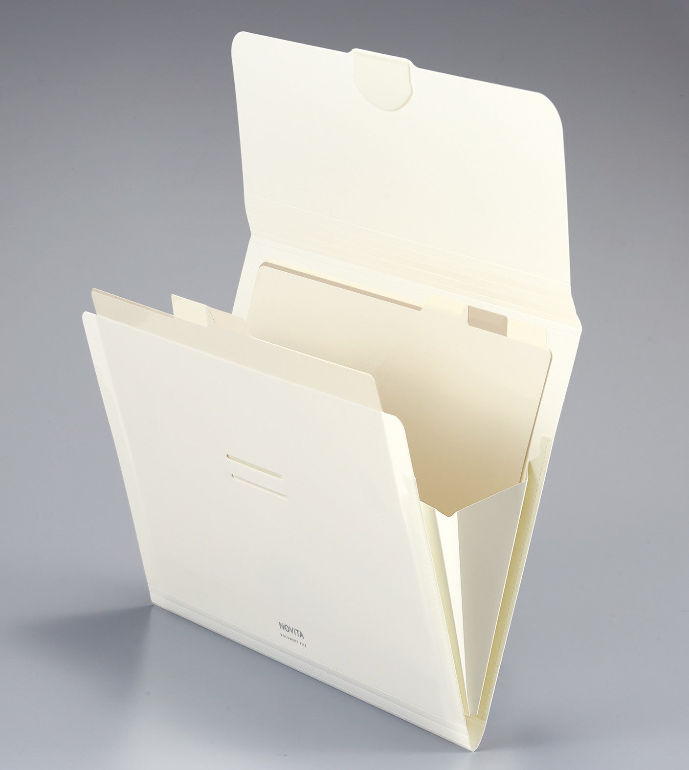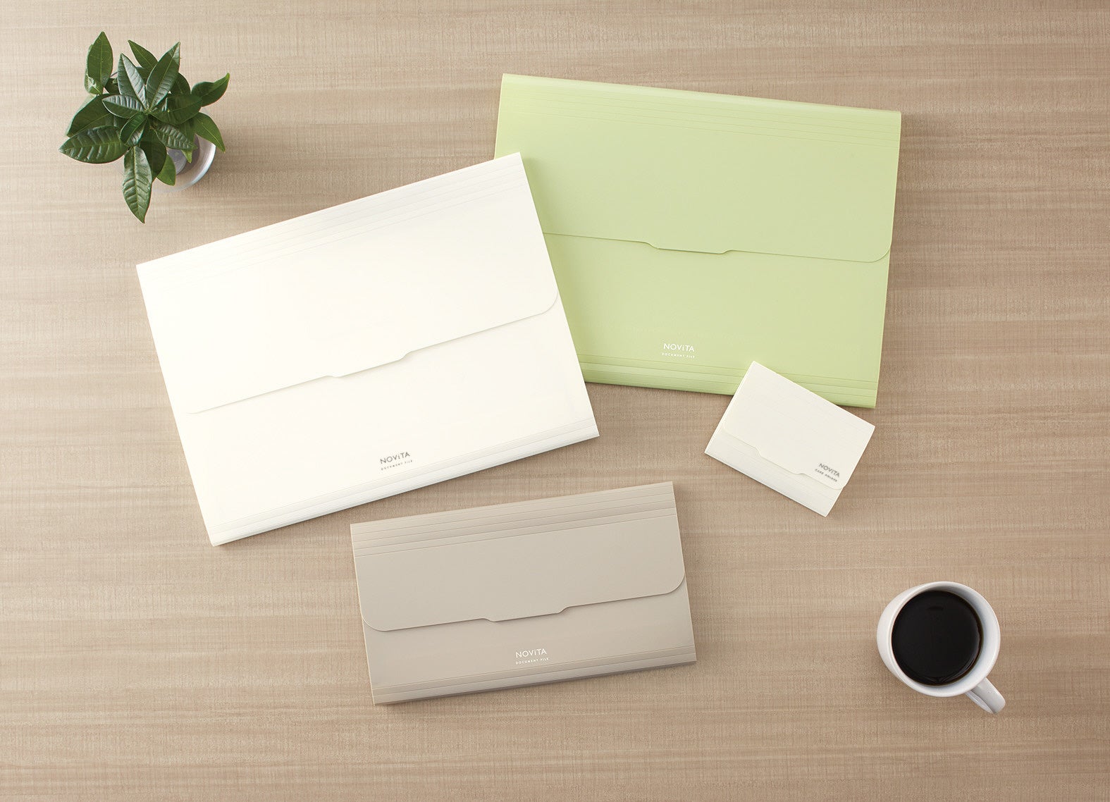 サイズは、一般的な書類に適したA4サイズ(6ポケット/12ポケット)に加え、長3封筒がそのまま入る封筒サイズと、名刺や診察券等の整理整頓にも便利なカードサイズをそろえました。カラーバリエーションはシンプルでありながらもあたたかみのあるオフホワイト、サンドベージュ、リーフグリーン(※)の3色で、計10品番をラインアップしています。(※リーフグリーンはA4サイズのみ)