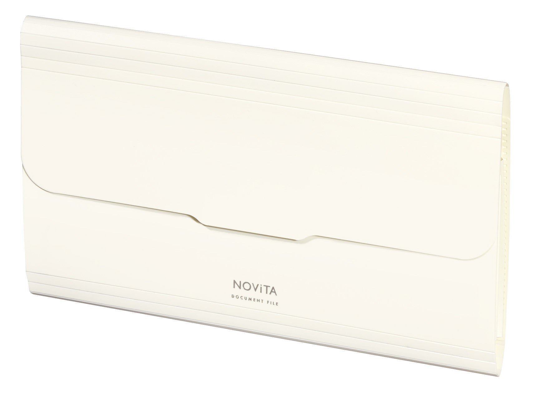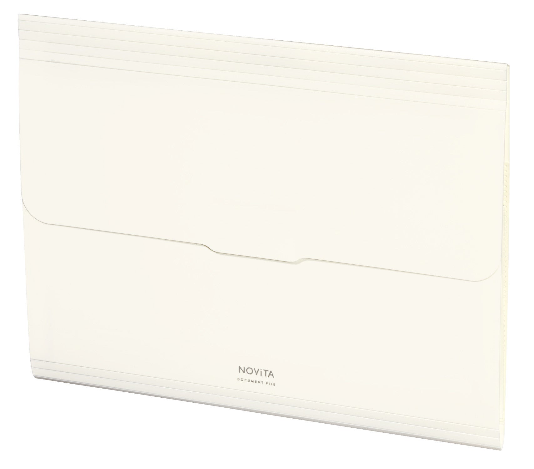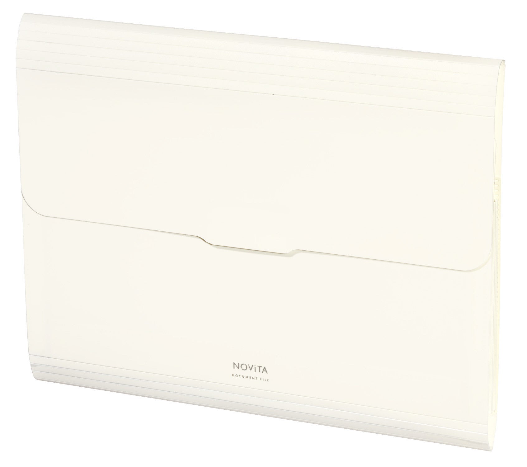 「ポケットが大きく開く書類ファイル<ノビータ>」は、仕切りが側面に固定されておらず、一般的なドキュメントファイルと比較して、ひとつひとつのポケットが奥から手前に大きく開く構造が特長です。これにより、ポケットの底の方までしっかり目が届くため、埋もれがちな小さいサイズの書類も探しやすく、また、書類の出し入れもしやすくなっています。