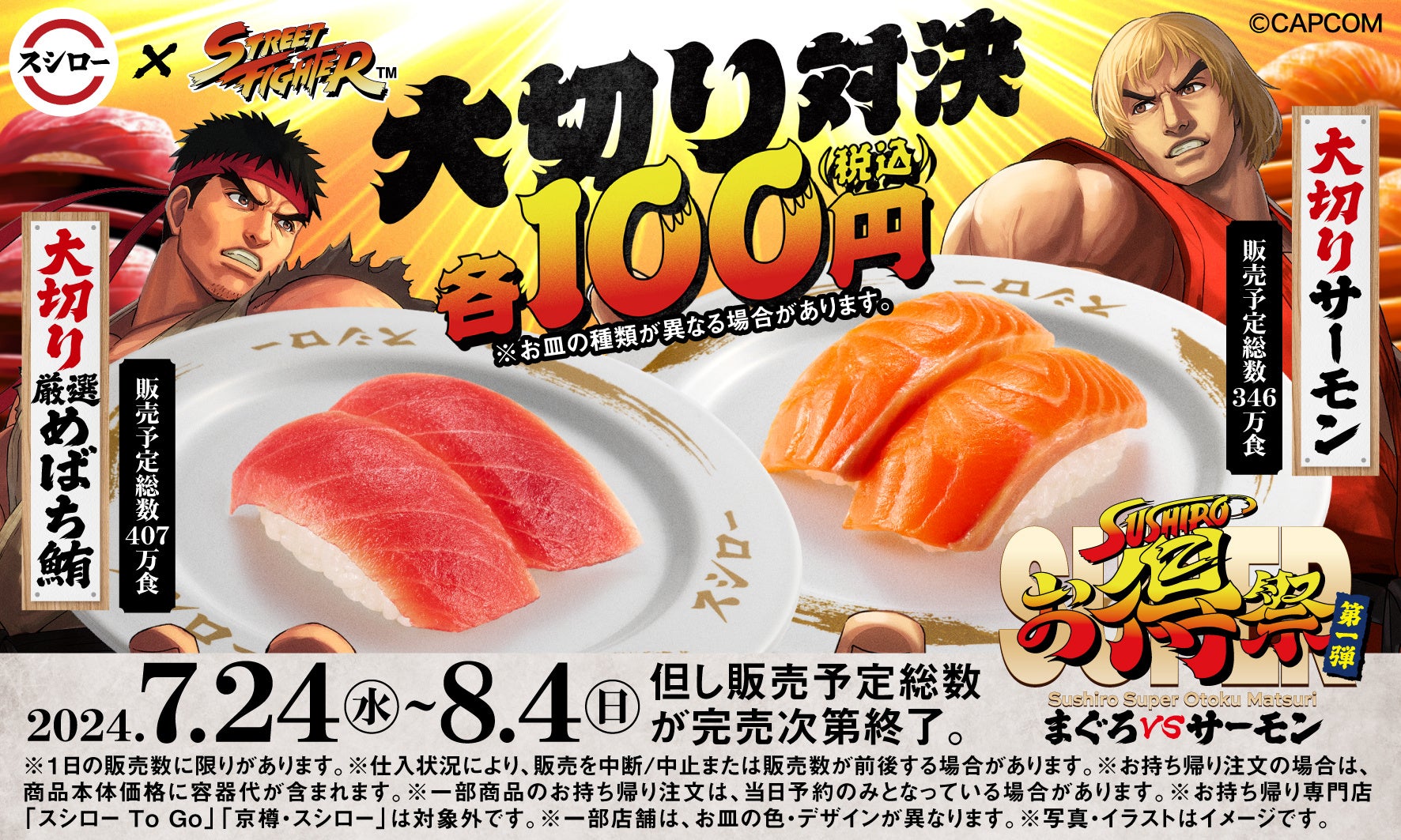 株式会社あきんどスシロー(本社:大阪府吹田市、代表取締役社長:新居 耕平)は、株式会社カプコンが展開する大人気格闘ゲーム「ストリートファイター」とのコラボ企画第一弾『スシローSUPERお得祭 [第一弾]大切り対決!まぐろVSサーモン』を7月24日(水)より実施いたします。