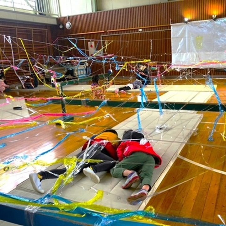 緑いっぱいの公園の森にとうめいテープを思いっきり張り巡らせたら、どんな空間ができるだろう?みんなが見つけた木の実や葉っぱも飾っちゃおう!子どもも大人も五感で楽しめる、造形ワークショップです。
