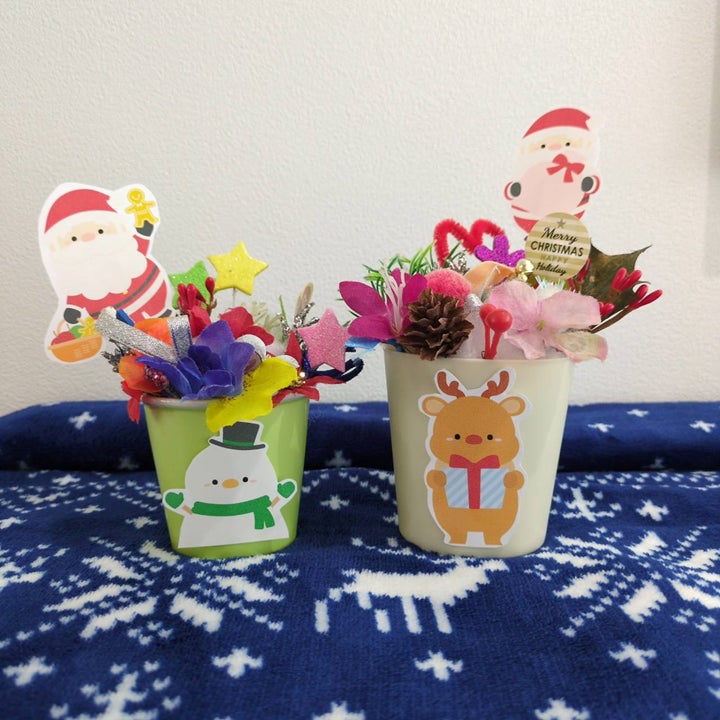 造花や飾りを使って、クリスマスに飾れるオリジナルフラワーポットを作るワークショップです。