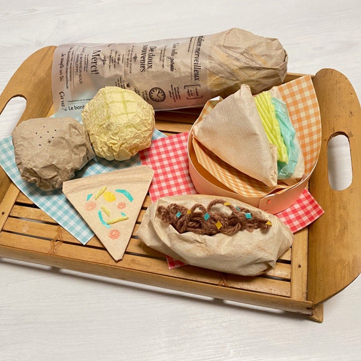 紙やスポンジなど色々な素材を使ってパンを工作します。作品が出来たら袋に入れて、パン屋さんごっこも!