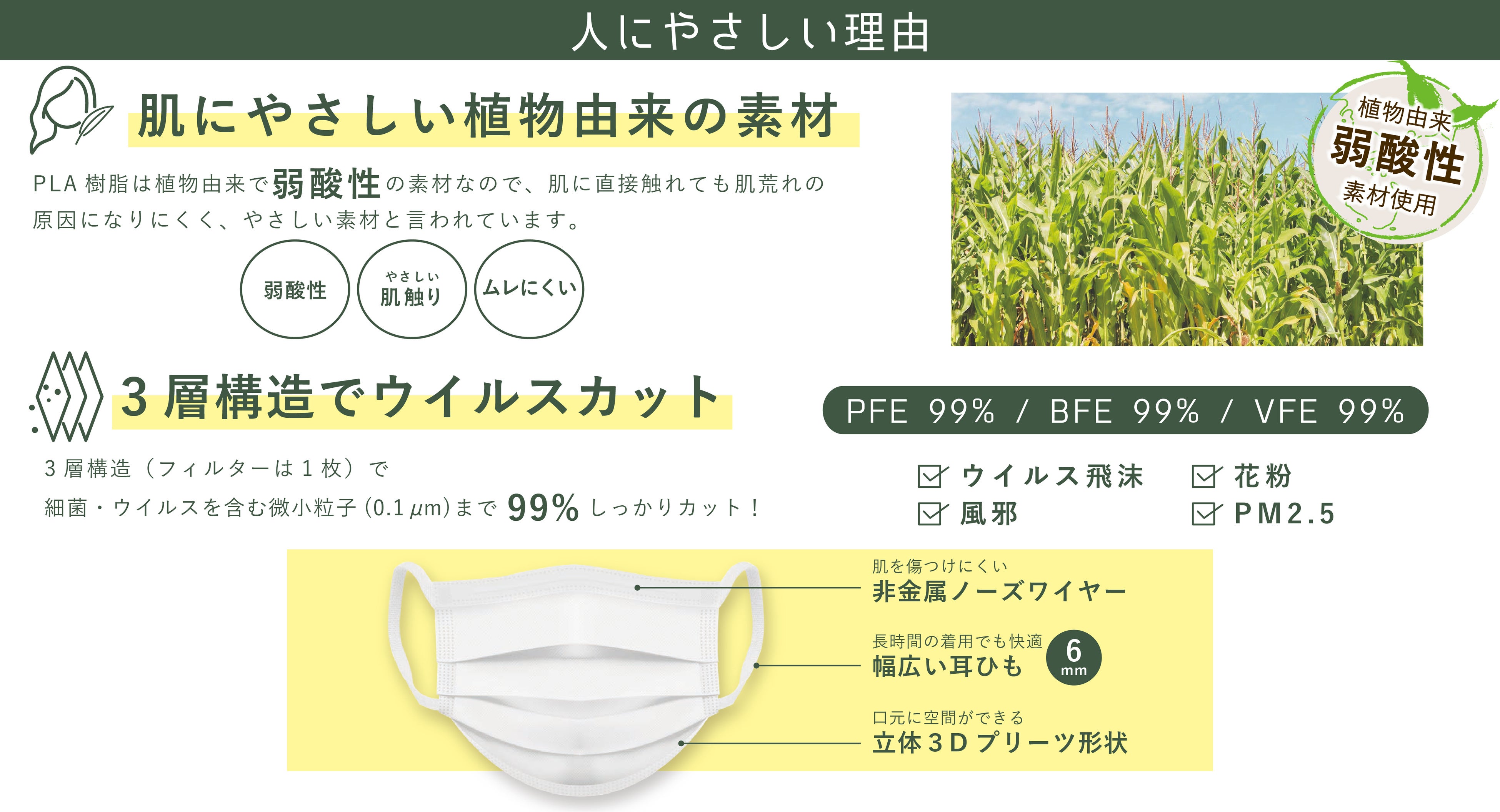 PLA樹脂(ポリ乳酸)でできた不織布は、製造・破棄する際に二酸化炭素の排出を軽減し、地球の温暖化へのリスクを減らします。生分解されたマスクが再び大地に還り、新しい自然を生み出すサイクルを構築することで、環境への負担を抑えることを目指します。「感染を予防しながら、ごみを流出させない。」環境負荷が低く、短期間で土に還ることができるマスクを通じて、私たちは地球環境の保全に取り組みます。