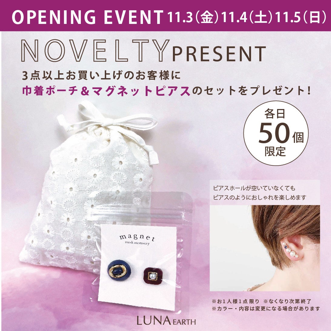 商品を3点以上のお買い上げのお客様に、巾着ポーチ&マグネットピアスのセットをプレゼントいたします。