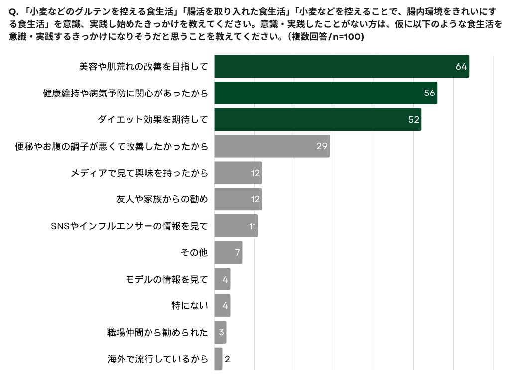 「小麦などのグルテンを控える食生活」「腸活を取り入れた食生活」「小麦などを控えることで、腸内環境をきれいにする食生活」を意識、実践し始めたきっかけを聞いたところ、一番回答が多かったのは、「美容や肌荒れの改善を目指して」が64.0%、次いで「健康維持や病気予防に関心があったから」が56.0%、「ダイエット効果を目指して」が52.0%など、主に美容・肌荒れ・ダイエットなどで求められ、モデル界隈の体調管理法として活用されていた。また、感じた効果を聞いたところ、「ダイエット」に効果を感じたのは80.0%、「肌荒れ改善」が75.0%、「美肌」が74.0%と、より美容に近いところで効果を感じたと答えており、モデル界隈のニーズに合わせた効果が、実感値を伴って受け入れられていることがうかがえた。(n=100・複数回答)
