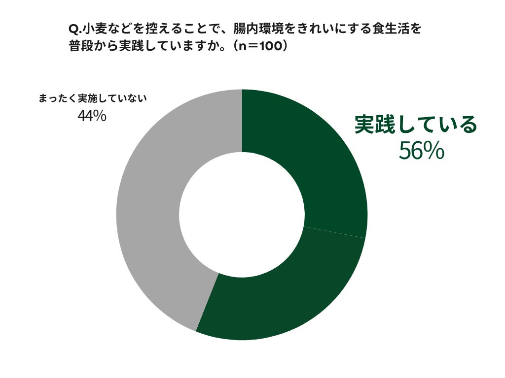 ヨガ/ピラティス実践者100人のうち、過半数(56.0%)が小麦などを控えることで、腸内環境をきれいにする食生活を実践していると回答。