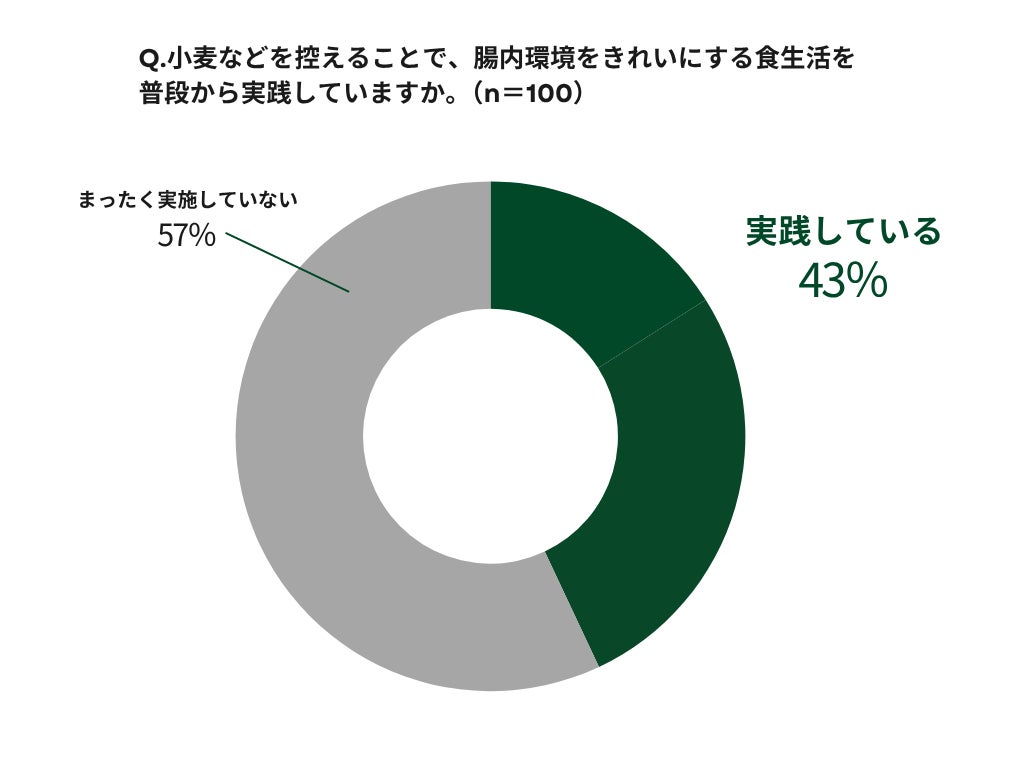 「小麦などを控えることで、腸内環境をきれいにする食生活」を実践しているかを聞いたところ、約4割(43.0%)が実践していると回答。Z世代からも、小麦を控える習慣と、それによって腸内環境をきれいにして体調管理をする意識があることがわかった。(N=100・単数回答)