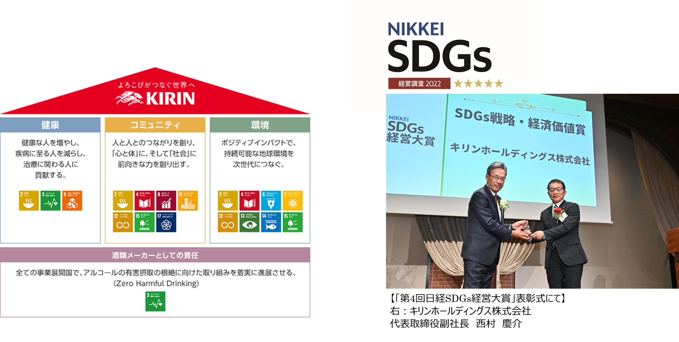 キリンホールディングス株式会社(社長 磯崎功典)は、「第4回日経SDGs経営大賞」にて「SDGs戦略・経済価値賞」を受賞しました。「SDGs経営」総合ランキングにおいては、昨年に続き4年連続で最高位である「★★★★★」(偏差値70以上)にランクインしました。