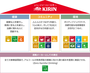 キリングループは、「酒類メーカーとしての責任」を果たし、「健康」「コミュニティ」「環境」という社会課題に取り組むことで、こころ豊かな社会を実現し、お客様の幸せな未来に貢献します。