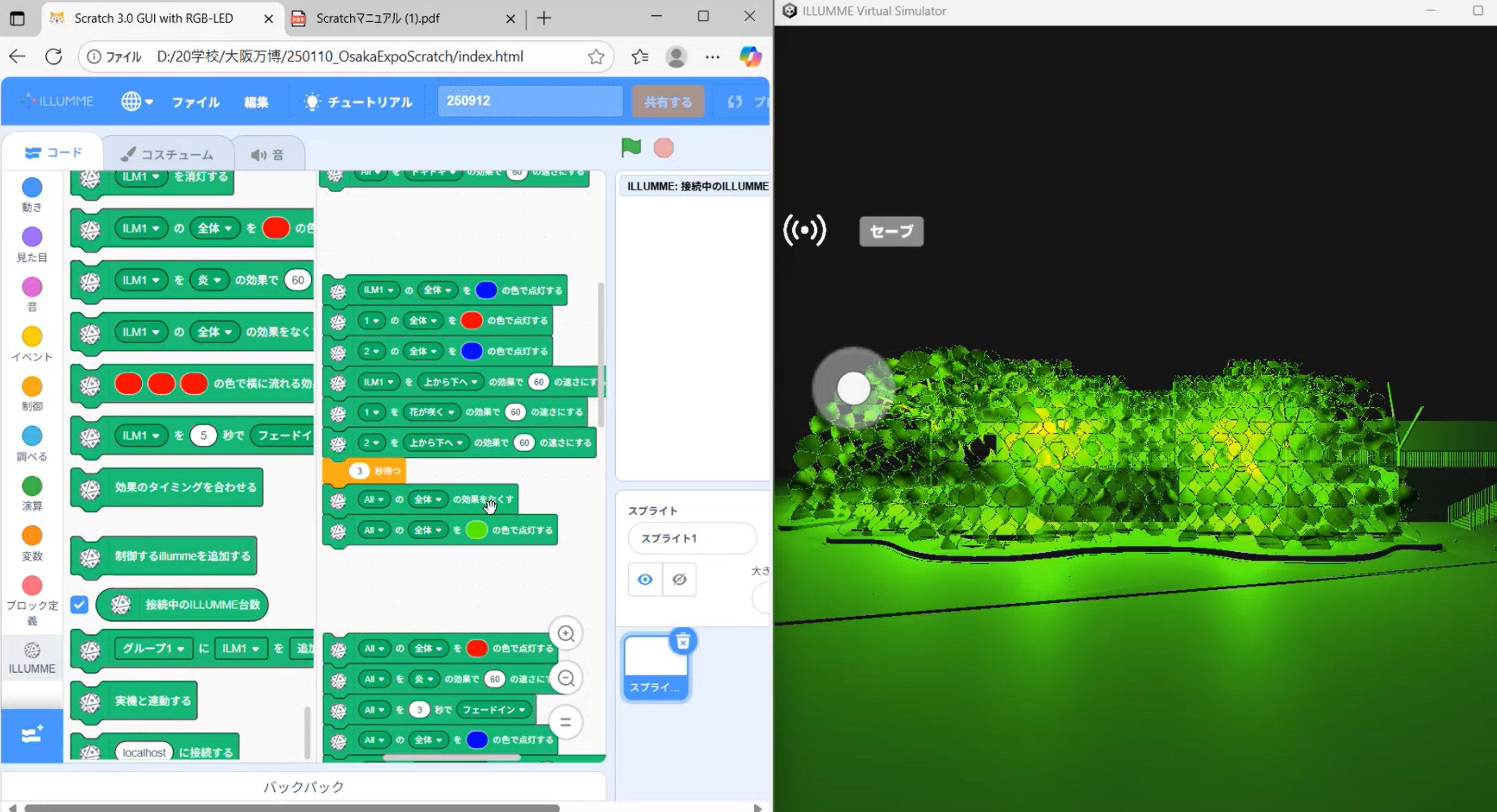 米子高専はパナソニック株式会社 エレクトリックワークス社の開発したプログラム制御可能な球体LEDデバイスである”ILLUMME”を用いた”光×アート×プログラミング”の伴走者として、令和2年より実証試験に協力してきました。その縁もあり、2025年大阪・関西万博でもパナソニックグループパビリオンにおける光・音のプログラミング演出に関わることになりました。万博に関する本企画は令和6年7月に立ち上がり、半年以上の期間を掛けて支援ツールの開発に取り組みました。そして、現地調整(令和6年12月夢洲)や子供向けのワークショップ(令和7年1月リゾナーレ大阪)を経て、万博開幕直前の令和7年3月に万博会場で点灯式が行われました。