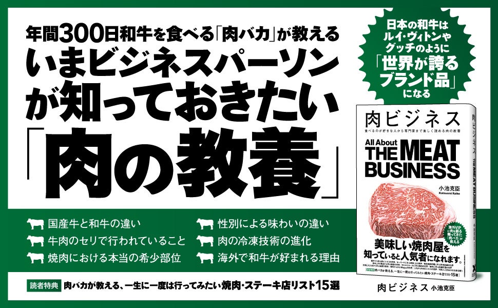 本書は、普段は会社員ながら、自らを「肉の求道者」と名乗り、SNS総フォロワー7万人を超える著者が、牛肉を中心に、肉の魅力とそれを取り巻くビジネスの構図をわかりやすく解説。世界に誇る日本の「肉食文化」について紹介した1冊です。シリーズ第1作の『魚ビジネス』への反響を受け、満を持して刊行します。