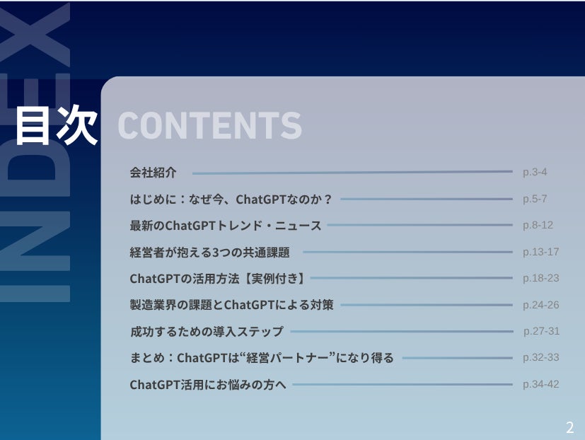 本レポートでは、経営者が直面する共通課題に対し、ChatGPTを活用した解決策や導入ステップを解説しています。さらに、ChatGPTの最新トレンドや業界別の課題と対策についても紹介しています。