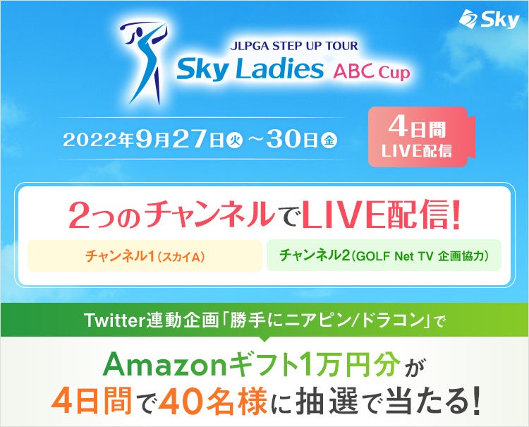 Sky株式会社が特別協賛し、2022年9月27日(火)~9月30日(金)の4日間で開催されるJLPGAステップ・アップ・ツアー「Skyレディース ABC杯」の中継映像を、「Sky株式会社 公式YouTube™チャンネル」にてライブ配信いたします。