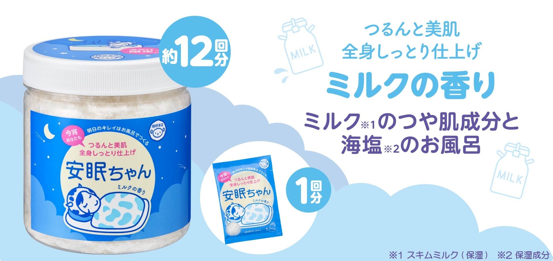 \ 全身しっとり仕上げ!ミルク*3のつや肌成分と海塩*2のお風呂 /