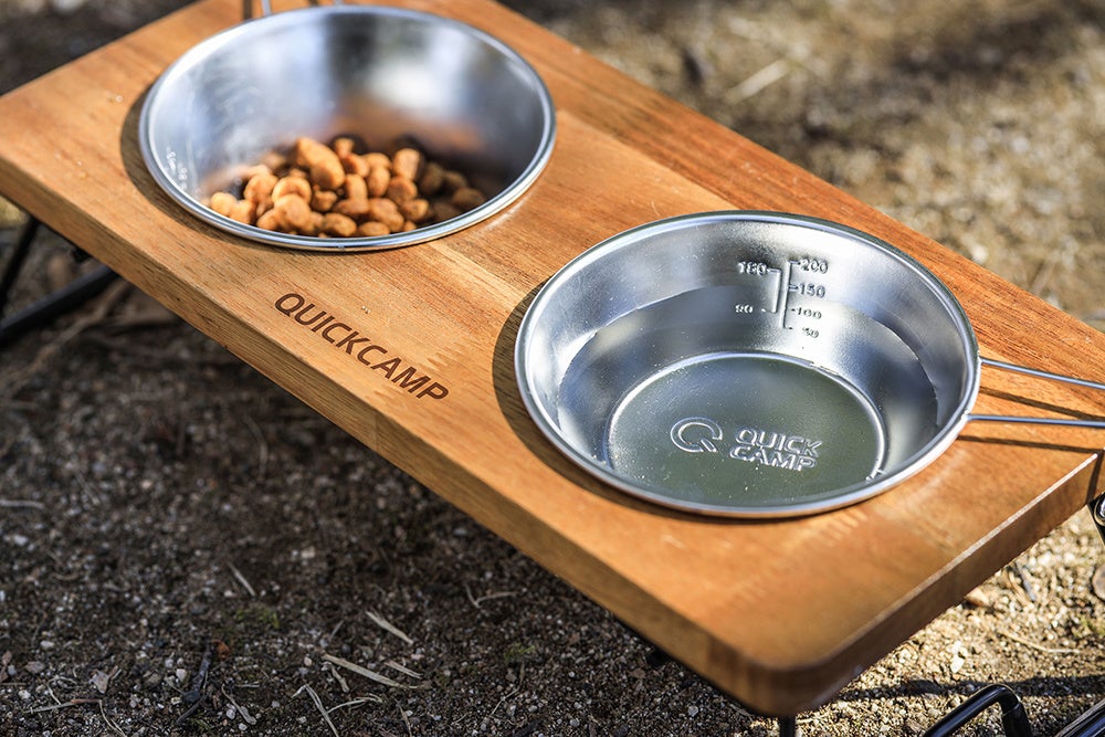 フードボウルには汎用性の高いシェラカップを採用。底面にはQUICKCAMPのロゴ入りの嬉しいアクセントポイント付き。目盛り付きのシェラカップになっているので、ペット用品だけではなく、キャンプ時の料理などにも使えます。洗いやすく、傷つきにくいので、常に清潔感があるフードボウルを維持することが可能です。