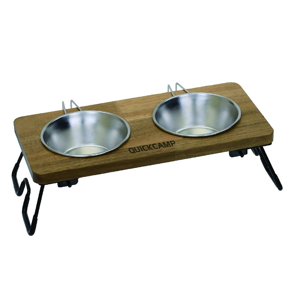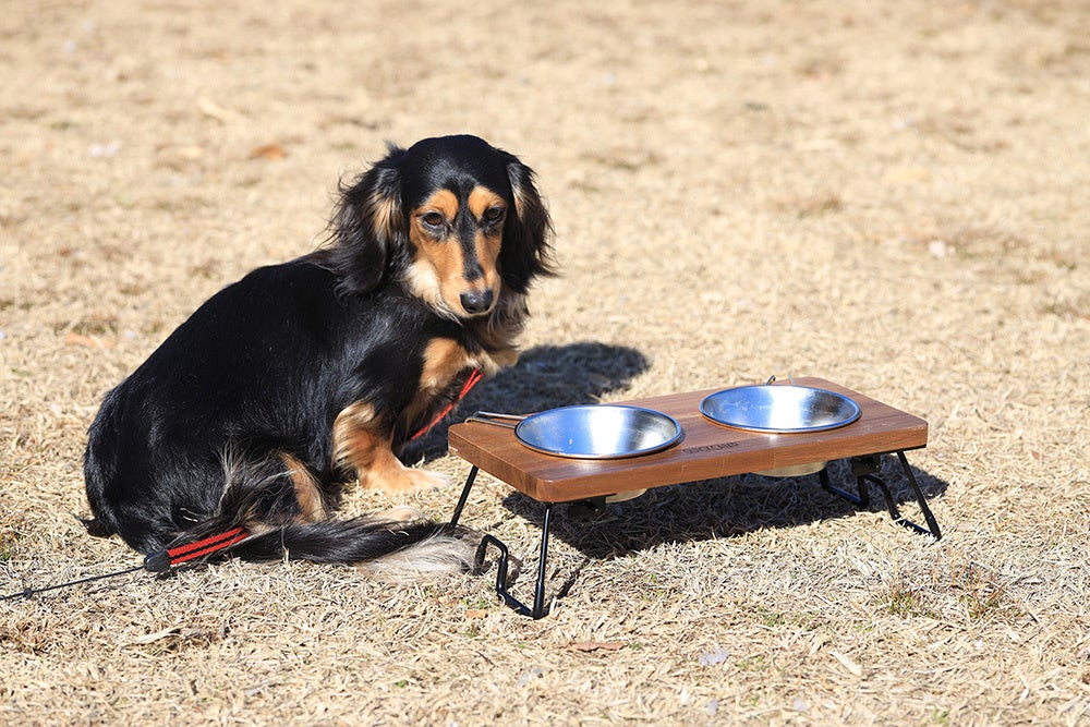 ペット用食器台の概念を覆すようなスタイリッシュな見た目。フードボウル(シェラカップ)をはめ込むプレートには木材を採用し、温かみのある雰囲気を持ちつつ、シェラカップのステンレス素材、脚部分はブラック塗装にすることで、バランスの取れた配色&素材感でお洒落な雰囲気に。キャンプサイトでも一目置かれるワンランク上のペット用品として、お使いいただけます。